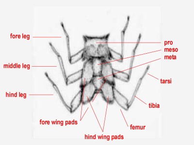 stonefly nymph has three segements, pro-thorax, meso-thorax, and meta-thorax. A pair of jointed legs is attached to each segment. Each leg has a (coxa and trochanter, not visible in illustration) femur, tibia, and tarsi. Fore wing pads are attached to the meso-thorax, and hing wing pads to the meta-thorax. |